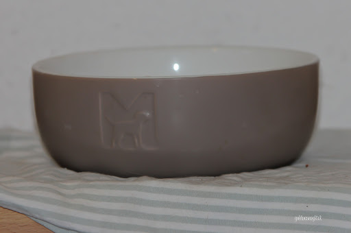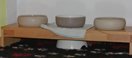 Dann stehen da noch zwei wunderschöne Keramiknäpfe von Treusinn *, die von uns als Futternäpfe genutzt werden. In der Mitte steht unser Trinknapf von Mia Cara *. Schaut doch wirklich toll aus, oder? 😉