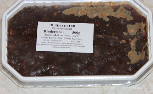 *Loulou geht jeden Samstag zum Schnüffeln, und Fleisch im Dummy wäre nicht gerade vorteilhaft. Wir füttern Wolfsblut, was auch von beiden hervorragend vertragen wird.